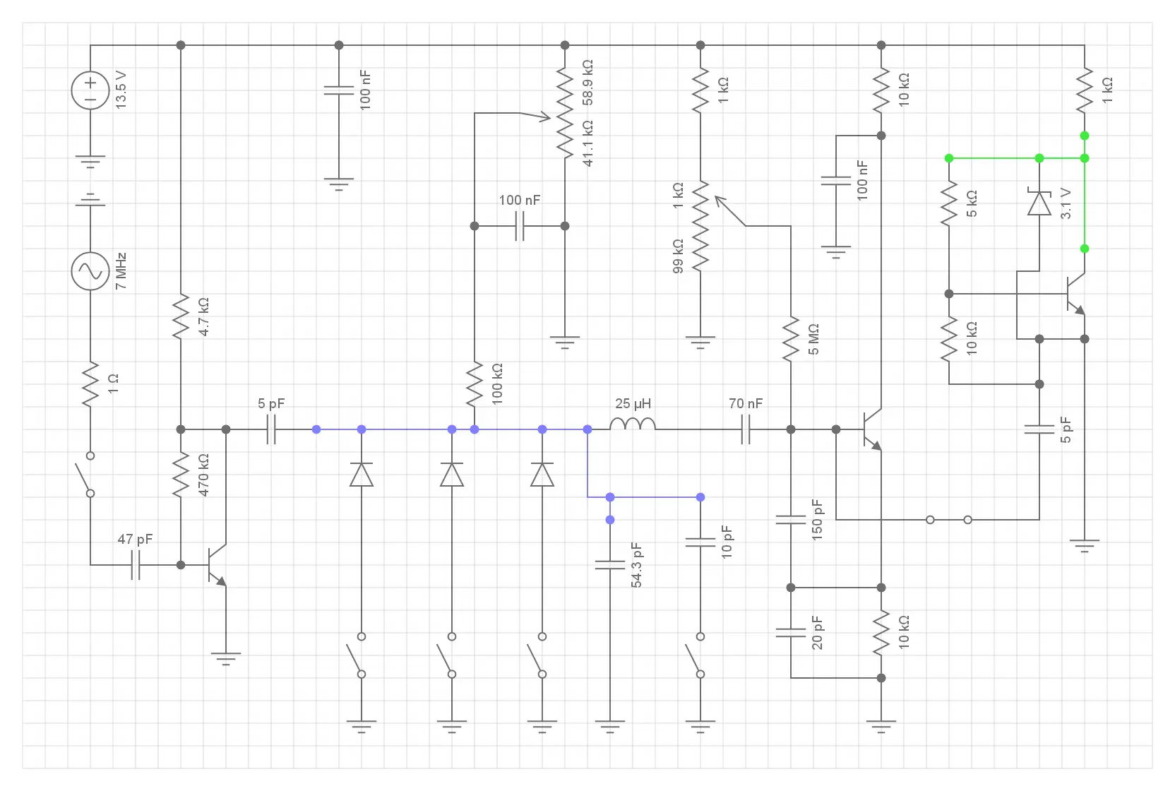 One of the prerequisites to allow such simple rectifier diodes to be used as capacitors to pull the frequency of the resonator over the whole of the 40 meter band, is a specialised oscillator design. This subject is dealt with in detail elsewhere on this site.